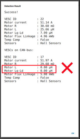 Every time the motor FOC configuration is completed, it is necessary to check whether the result is available. Forcing the motor to run with an incorrect result may blow up the electronic speed controller! If you encounter a result like this, please restore the parameters to default and then perform the FOC configuration again.