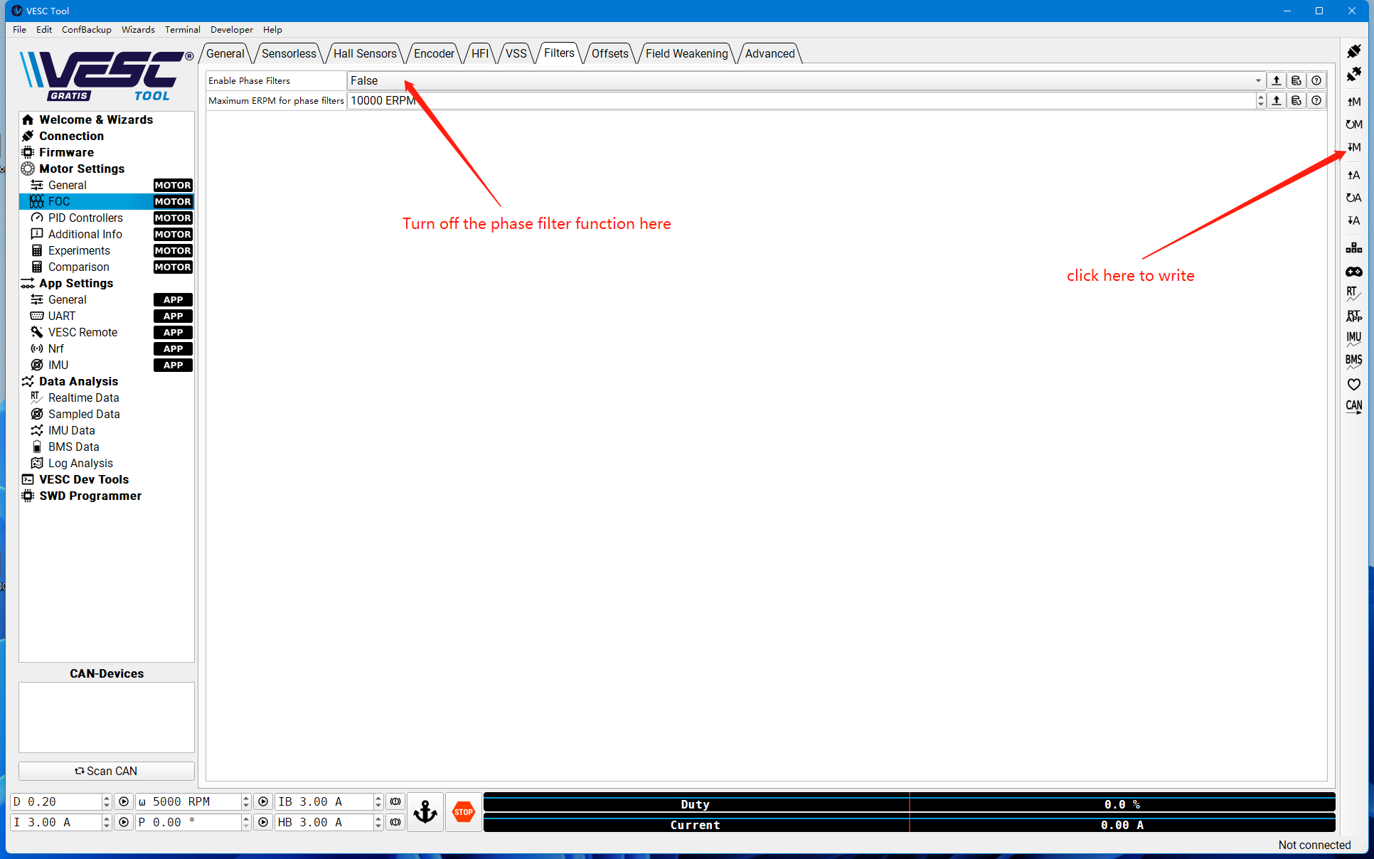1.Go to the "FOC" page, find "Filter", select "False" and write to the ESC.