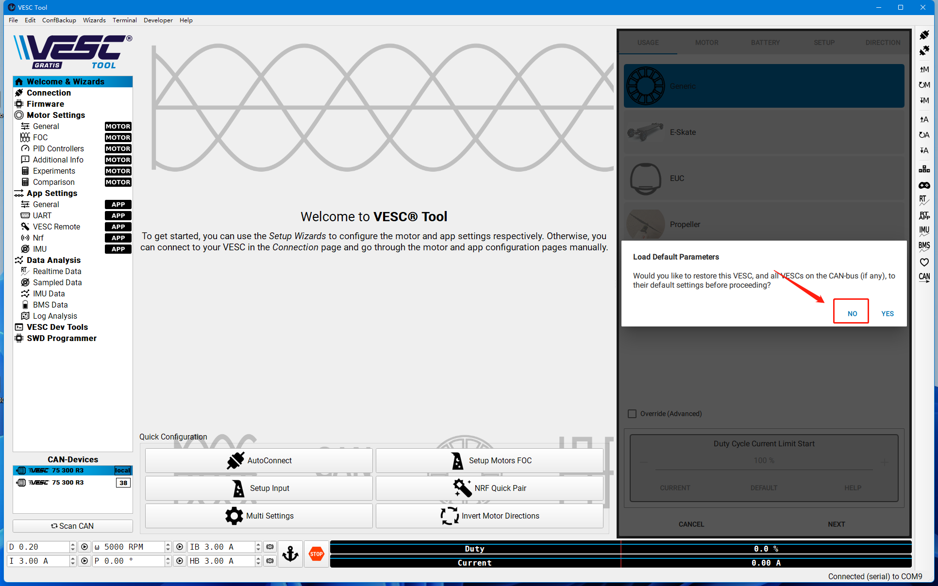 2.After , please do not choose restore the default parameters when using wizards to Configure the motor.
