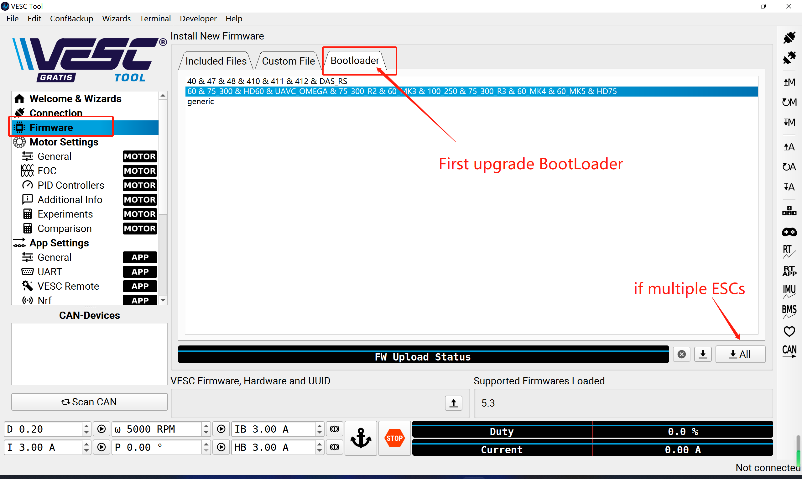 Enter the firmware page, go to the BootLoader page, click "ALL" to upload the BootLoader to all ESCs, then enter the custom firmware page to select the corresponding firmware file (.bin), click ALL to upload to all ESCs.